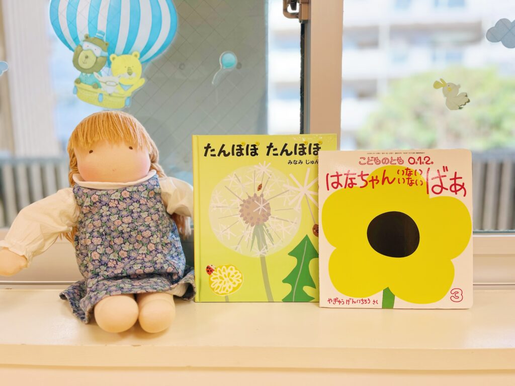 全クラス、春にちなんだ「わらべうた絵本」を取り入れましたが、特に1歳児クラス、2、3歳児クラスは一緒にたんぽぽの綿毛を「フゥ〜っ!!」と飛ばすセリフも元気に行ってくれましたし、その後のスカーフ遊びに繋げた活動では何度も繰り返し行っては、その都度素直に感動していました。